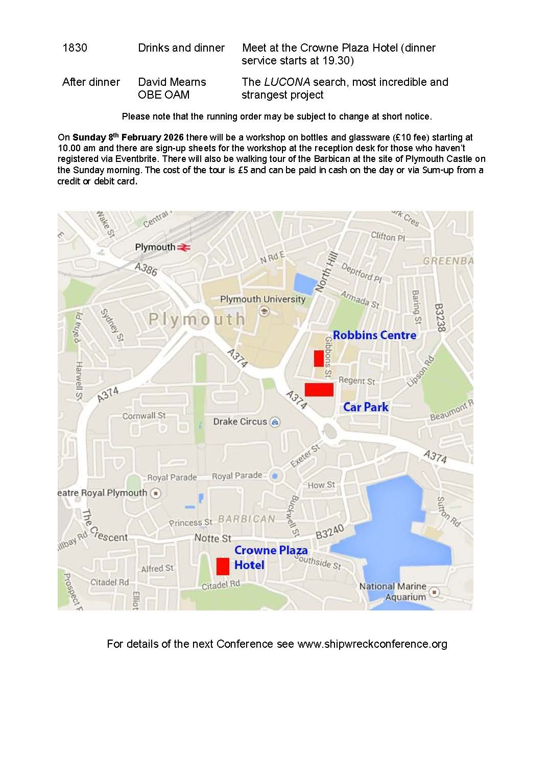 2) The Sunday Tour will be at ta walking tour of the Barbican at the site of Plymouth Castle . Please register with Eventbrite if you plan to attend. Payment for the walking tour is on the day.